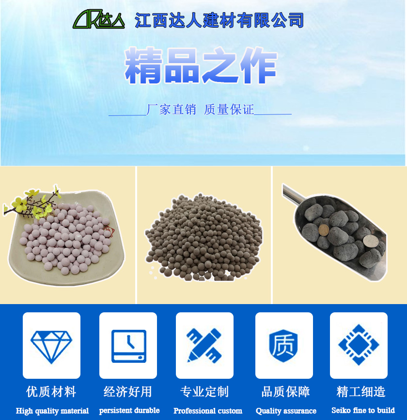 江西達(dá)人建材有限公司所生產(chǎn)的陶粒輕質(zhì)性更佳,具有密度小、強(qiáng)度高、吸水率大、保溫、隔熱、耐火、抗震等特點(diǎn),用途十分廣泛,在取代普通砂石配制輕集料混凝土,用作水處理濾料、吸附劑、透水路面材料甚至于農(nóng)業(yè)、園林中無土培養(yǎng)基、橋面板??招钠鰤K等建材原料都有著十分耀眼的表現(xiàn);